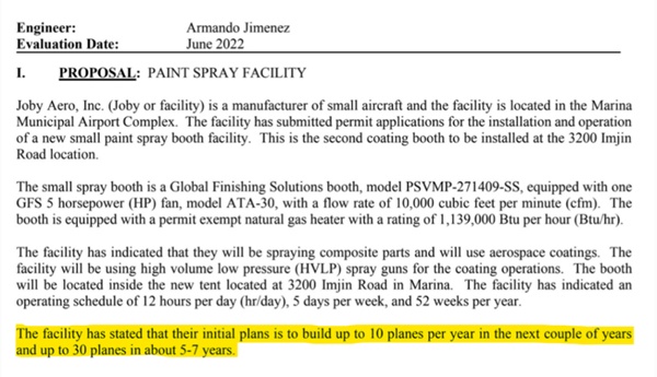 이 기록에 따르면 조비는 올해 6월말 당국에 제출한 보고서에서 캘리포니아 마리나(Marina) 시의 시범 시설에서 향후 2년 동안(2023, 2024) 연간 10대의 eVTOL기만을 생산할 계획이라고 이 지역 관리들에게 서면 보고하고 있다.