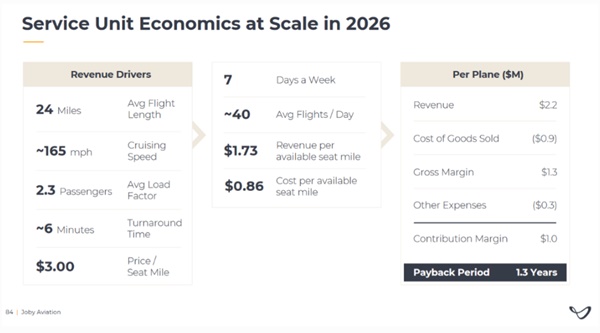 조비는 2026년까지 20억 5000만 달러의 매출을 창출하는 963대의 항공기를 보유할 것이라고 주장한다. 조비의 투자자 설명회 발표에 따르면 조비는 규모에 따라 eVTOL기 한 대로 220만 달러의 매출을 얻는다고 주장한다.