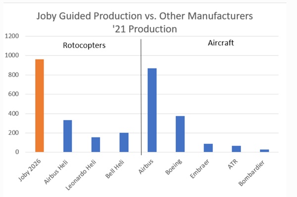 크리스 드로스는 자신의 짧은 보고서에서 조비가 “오는 2026년 대당 하루에 40번 비행을 하며, 그 해 연말까지 약 963대의 항공기 운항을 목표로 하고 있다는 점에 주목하고 있다…이것은 연간 약 1,400만 번의 비행을 의미한다. 작년에 FAA는 미국에서 1,640만 번의 비행을 감독했다. 조비의 지침은 매우 공격적이어서 미국에서 이륙하는 항공기 수가 매일 거의 두 배로 증가한다는 것을 시사한다”고 밝혔다.
