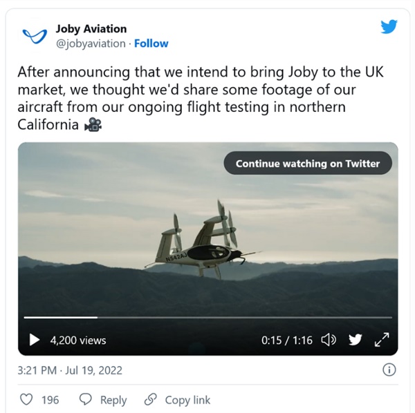 조비는 자사가 1000회 이상의 성공적인 eVTOL기 테스트비행에 성공했다고 발표했다. 이 회사는 현재 우버, 도요타, 미국방부,SKT 등과 제휴하고 있다.