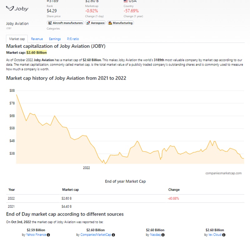 조비의 주가는 29일 블리커 스트리트 캐피털의 부정적 분석과 전망으로 연초부터 현재까지 약 36%대정도 하락했다. 조비의 시총은 3일 증시에서 26억1000만달러 대를 기록하고 있다.