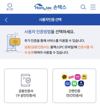 올해 연말정산 서비스는 공동인증서와 함께 각 금융사, 빅테크 기업 등의 사설인증서도 사용할 수 있다. (이미지=손택스 화면 캡처)