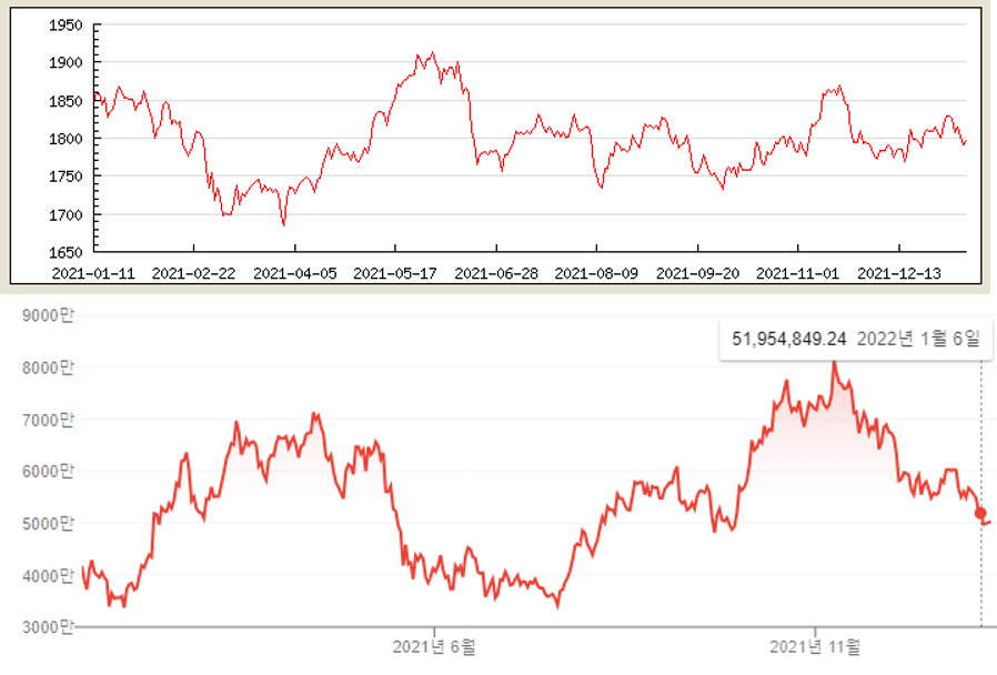 가상자산을 대표하는 비트코인의 지난해 상황을 돌이켜 보면 독특한 현상을 확인할 수 있다. 금 거래 시장과 대비되는 시세 변화인데, 금값이 떨어지고 거래량이 줄어드는 시점과 비트코인의 가격과 거래량이 오름세를 기록하는 시점이 대체로 교차하는 상황이 연출됐다.