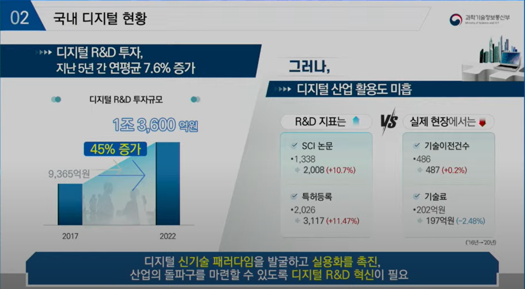 행사의 첫 발표를 맡은 윤두희 과기정통부 정보통신방송기술정책과장은 ‘디지털 기술혁신 및 확산전략’을 주제로 한 발표 첫마디부터 쉽지 않은 글로벌 상황을 언급했다. 그나마 다행인 점은 우리나라의 연구개발 투자는 지난 5년간 연평균 7.6% 증가해 왔다는 사실이다.