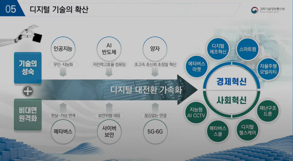 “지금 바야흐로 세계는 전쟁입니다. 과거에 했던 무력전쟁이 아니라 기술을 가지고 그 해게모니를 잡으려고 하는 전쟁을 하고 있습니다. 그 중에서도 특히 세계는 세상의 삶을 바꾸는 디지털 기술에 주목을 하고 있습니다. 그런 패권 경쟁이 가속화되는 가운데 우리는 굉장히 쉽지 않은 상황이 이렇게 놓여 있습니다. 미국은 압도적으로 흔들리지 않는 모든 분야에서 1등을 차지하고 있고 중국은 이미 2018년부터 상당히 많은 분야에서 우리나라를 앞질러 버렸습니다. 그런 상황에서 우리의 주력 제품이라 할 수 있는 반도체, 디스플레이, 스마트폰 등의 점유율은 점점 떨어지고 있는 상황이죠. 이에 새정부의 전략은 ‘이 위기를 어떻게 타개해 나갈 것인가’라는 고민을 바탕으로 마련됐습니다.”