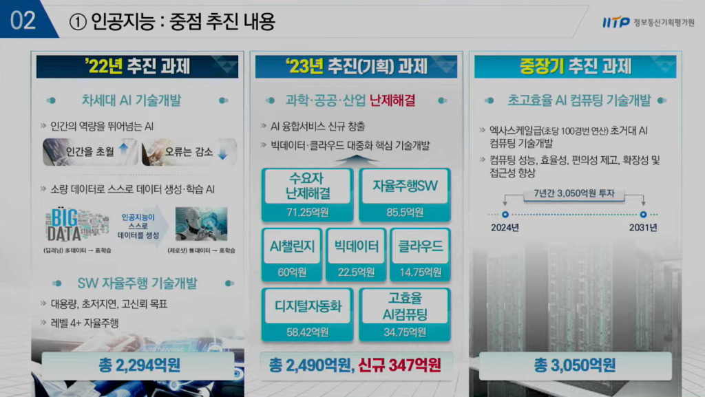 이는 최근 우리나라 AI 기술 경쟁력 확보를 위한 대안으로 꼽히고 있는 ‘소량의 데이터로 스스로데이터 생성 학습이 가능한’ 차세대 AI 기술 개발도 포함 돼 있다. 그 외에 구체적인 난제 해결 과제로는 자율주행, 빅데이터 등이 있으며 중장기적으로는 엑사 스케일급 초거대 AI 컴퓨팅 기술 등과 같은 초고효율 AI 컴퓨팅 기술 개발 등이 추진된다.