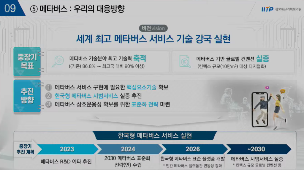 이날 문 단장의 발표에서 관심을 끈 또 다른 분야는 다름 아닌 ‘메타버스’ 였다. 정부는 ‘세계 최고 메타버스 서비스 기술 강국 실현’을 비전으로 삼고 최고국 대비 90% 이상의 기술력 축적과 더불어 메타버스 기반 글로벌 컨벤션 실증, 즉 킨텍스 규모인 10만㎡ 대상 디지털화를 중장기 목표로 설정했다.