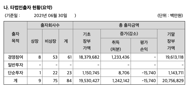 SK㈜가 다른 법인에 자금의 출자한 기업만 해도 2021년 6월 기준 84개 회사에 달합니다. SK스퀘어의 포트폴리오 윤곽은 이미 갖춰진 셈입니다.
