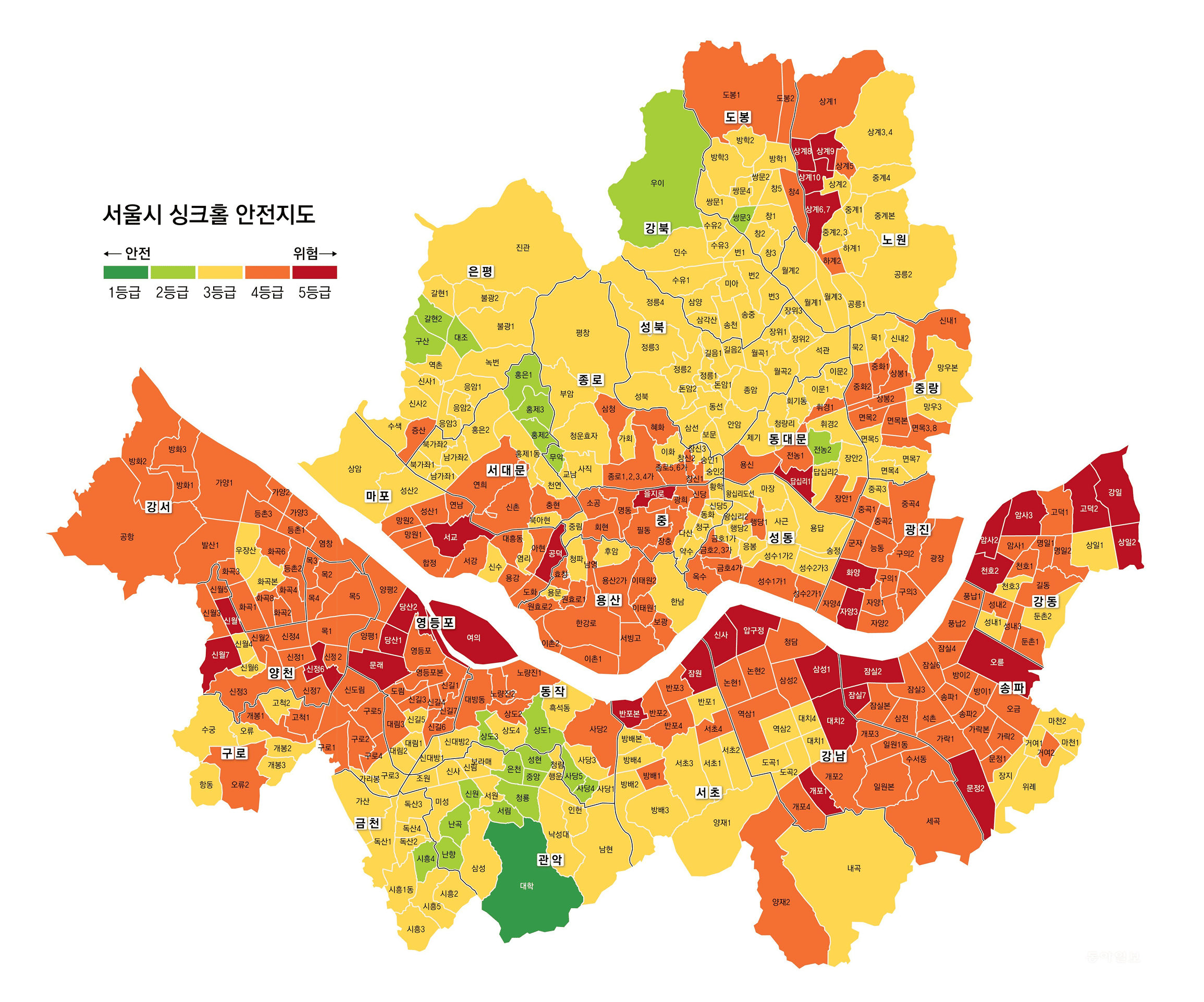 출처 링크에 접속하면 사용자는 행정구역 ‘동’을 기준으로 위치를 파악하고, 위험도를 색상으로 파악할 수 있는데요! 위치를 데이터를 표현할 때 가장 일반적인 시각화 유형을 활용해 창의성 부분에서는 2점으로 낮은 점수를 받았지만, 사용자가 ‘시민’임을 고려해 익숙한 유형을 선택한 것이 도리어 적절한 선택이었다고 평가했습니다.