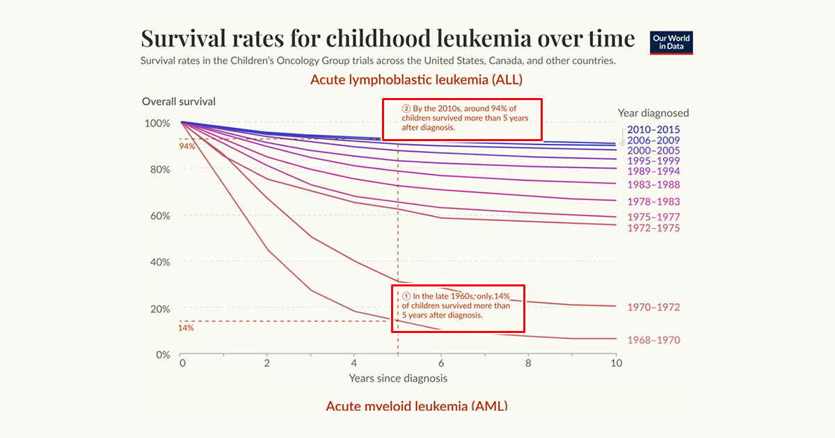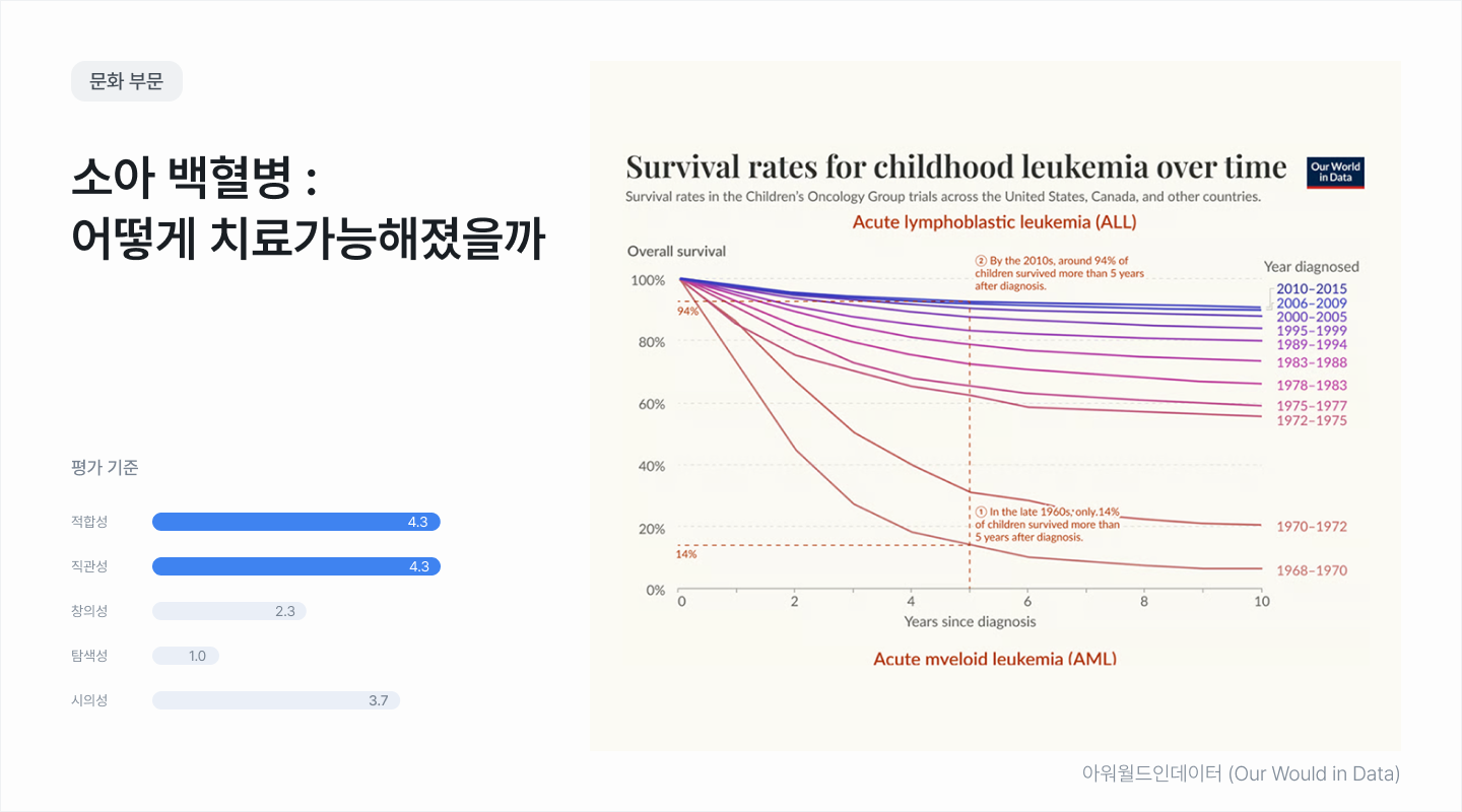 위 사례는 라인 차트로 ‘소아 백혈병 생존율의 변화’를 보여주고 있습니다. 여기에 진단받은 연도를 색으로 구분해 독자는 현대에 올수록 소아 백혈병의 생존율이 높아지고 있다는 핵심 메시지를 명확하게 알 수 있죠! 모두에게 익숙한 차트와 간단한 구성을 선택해 어려운 전문 데이터일지라도 사용자 누구나 쉽게 핵심 인사이트를 얻을 수 있도록 세심하게 배려했다는 점에서 적합성에서 높은 점수를 받을 수 있었습니다.