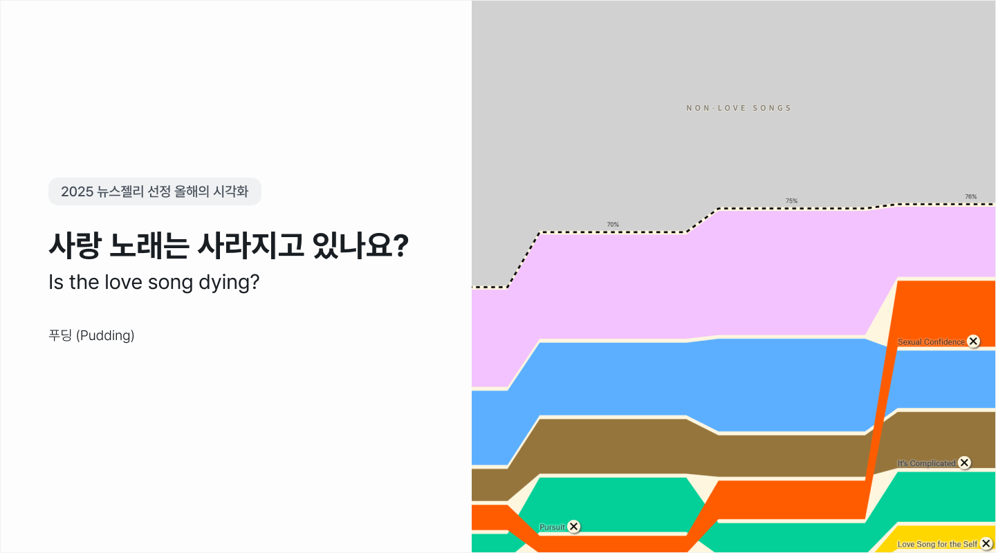 2025년 영예의 ‘올해의 데이터 시각화’ 수상작은 ‘문화’ 부문의 푸딩(The Pudding) ‘사랑 노래는 사라지고 있나요?(Love song is dying?)’ 콘텐츠가 선정되었습니다. 데이터 시각화는 단순히 데이터 분석 결과를 전달하기 위한 목적뿐만 아니라 데이터에서 의미를 찾아내는 데이터 분석 과정부터 의미 있는 역할을 하는데요!