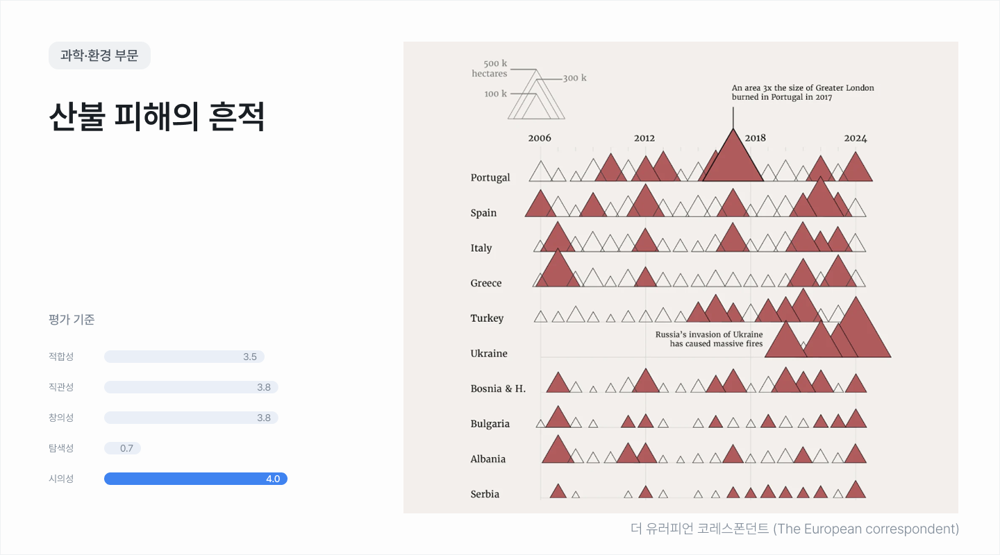수상작은 직관성과 창의성 부분에서 각각 3.8점으로 높은 점수를 받았습니다. 데이터 시각화를 할 때 ‘시각화를 통해 무엇을 전달하고자 하는가’에 따라 적합한 시각화 유형을 선택하는 것이 중요한데요! 위 사례에서는 주제인 ‘산불’이 연상될 수 있도록 삼각형을 중심으로 표현한 점이 인상 깊었습니다. 삼각형의 크기로 피해 규모를, 붉은 색상으로 수치 증가를 알 수 있는데요! 주제와 직결되는 시각적 요소를 활용해 주제를 강조하고, 전달하고자 하는 메시지를 명확하게 드러냈다는 점에서 높은 평가를 받았습니다. 여기에 시계열 데이터를 더해 어느 해에 산불이 많이 일어났는지, 피해 면적의 추이가 어떠했는지를 잘 보여주고 있죠!