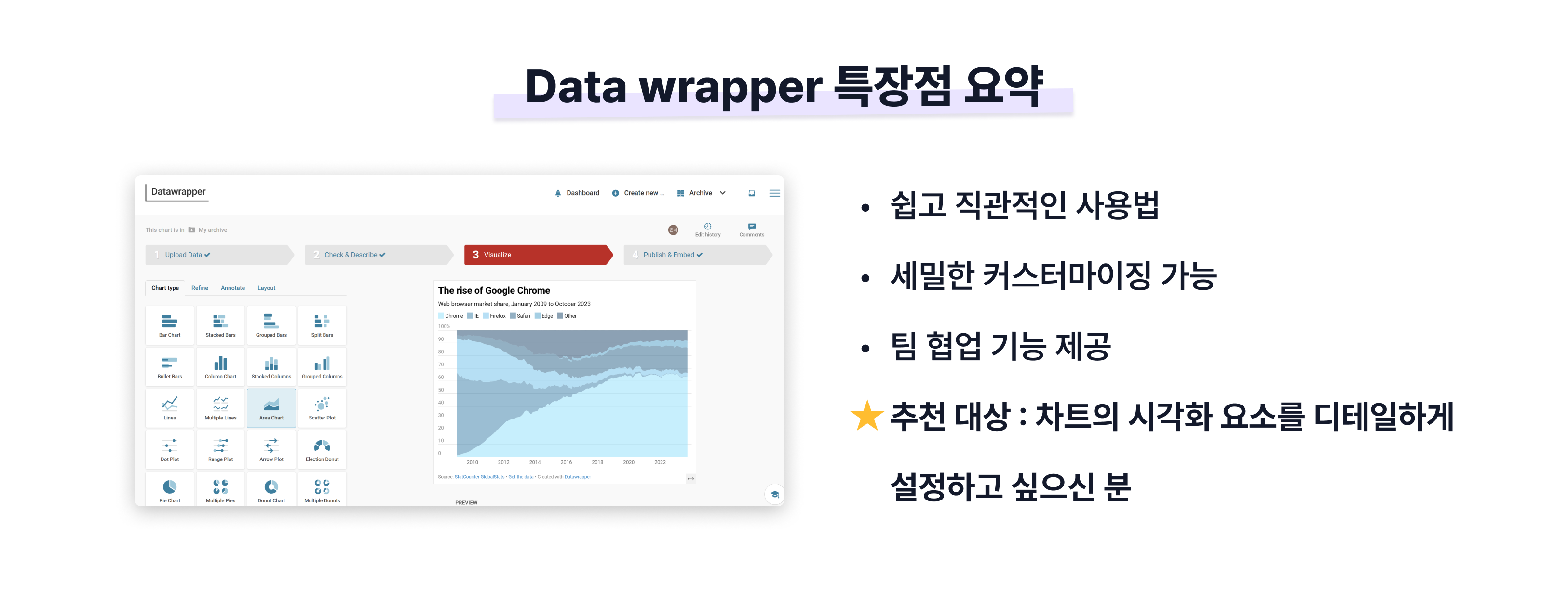 이어서 Daisy Basic처럼 쉽고 직관적으로 사용할 수 있으면서도 조금 더 세밀하게 축, 레이블 등의 시각화 요소를 조정하고 싶은 경우에 활용해 볼 법한 Datawrapper를 추천해 드립니다! Datawrapper는 BBC, 뉴욕타임스와 같이 미국의 주요 언론사에서 자주 활용하는 시각화 툴로 유명한데요.