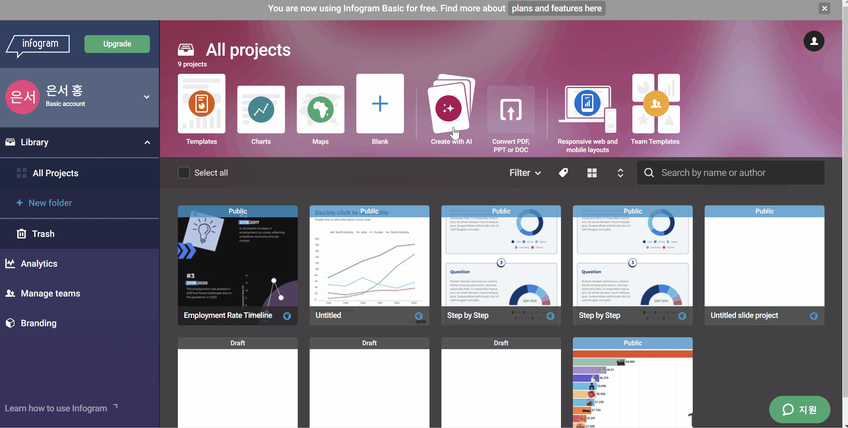 혹시 데이터에 맞는 템플릿이 무엇인지 잘 모르겠다면, Infogram의 가장 흥미로운 기능인 ‘Create with AI’를 활용해 볼 수 있는데요! Infogram에서 해당 기능을 누르고 제작하고 싶은 시각화의 주제를 간단히 입력하면 AI가 템플릿을 추천해 줍니다. 인포그래픽, 단일 차트, 슬라이드 등 다양한 템플릿이 포함되는데요. 특히 인포그래픽의 경우 제목이나 페이지 구성, 아이콘 등이 함께 제공되어서 디자인 고민을 덜 수 있습니다.