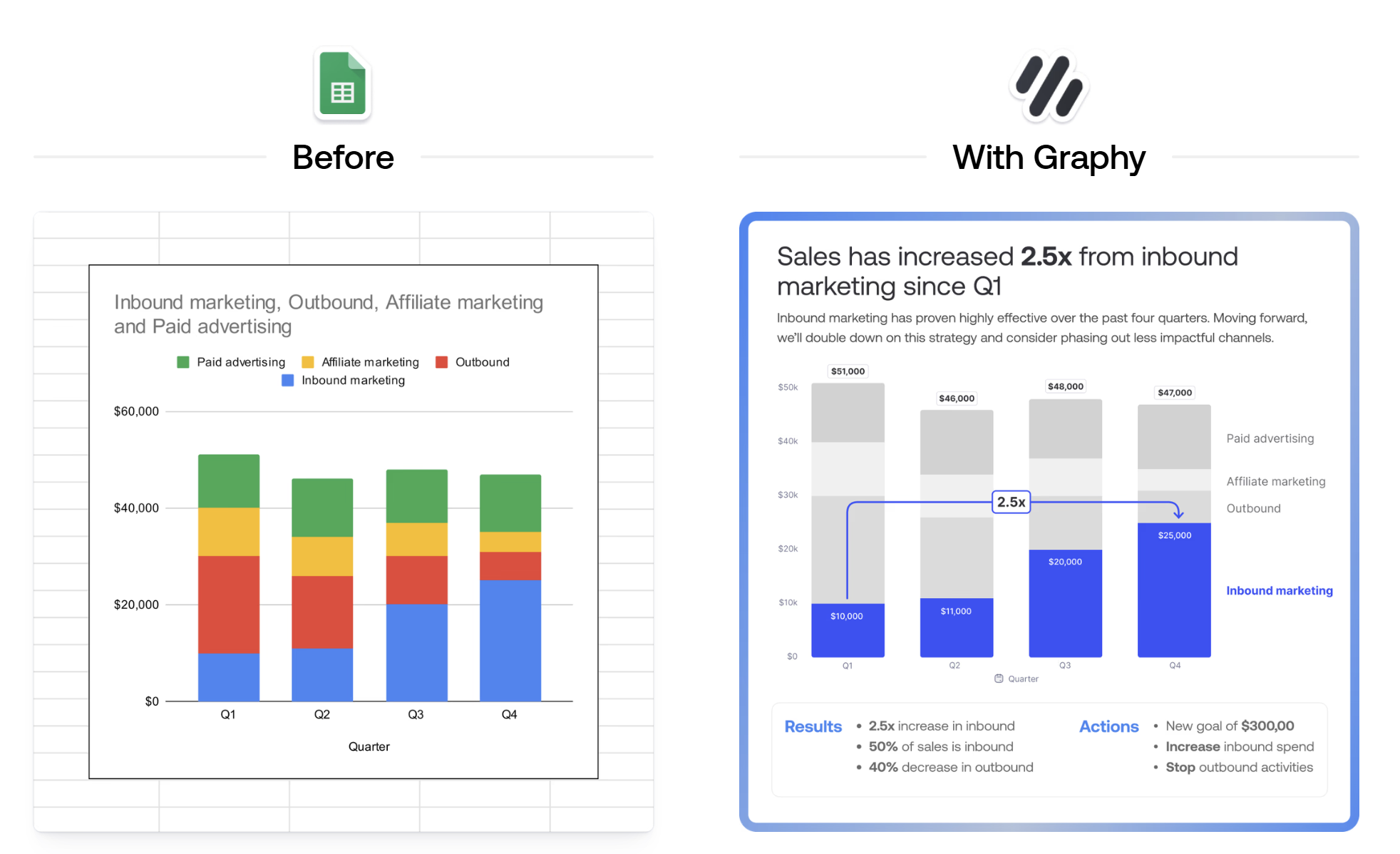 위 이미지 속 왼쪽, 오른쪽의 차트를 비교해 보시면 Graphy의 장점이 더욱 드러나는데요! 왼쪽의 차트는 잘못 제작되지는 않았지만 차트를 보는 사람이 어디부터 봐야 할지, 어떤 인사이트를 도출해야 할지 쉽게 알기는 어렵습니다. 하지만 오른쪽, Graphy로 제작한 차트에는 데이터의 증가폭을 화살표와 수치로 나타내거나 강조해야 하는 데이터 조각을 파란색으로 하이라이팅 해서 더욱 수월하게 인사이트를 도출할 수 있어요.