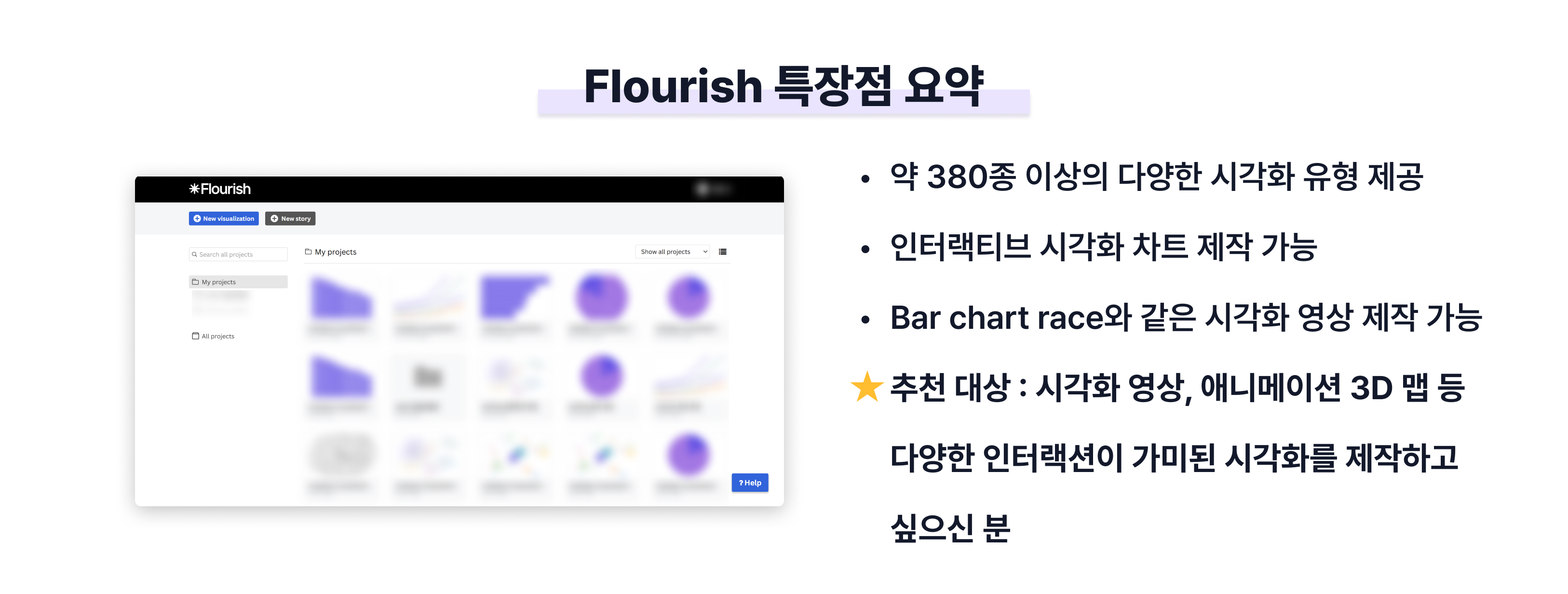 지금까지는 대부분 정형화된 시각화 차트 제작을 위한 툴을 소개했는데요. 웬만한 시각화 차트는 만들어 보았고, 이제는 조금 더 독특하고 생동감 있는 차트를 제작해 보고 싶다고 생각하시는 분들이 계실 것 같아요. 그렇다면 마지막으로 소개할 시각화 툴, Flourish를 사용해 보시길 추천합니다!