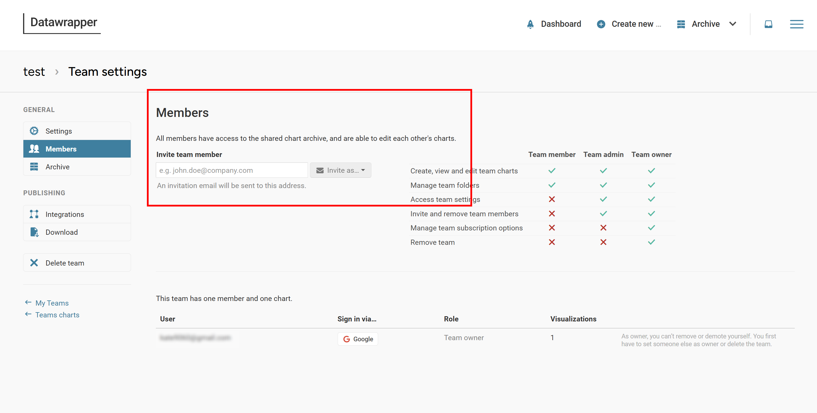 또, Datawrapper는 팀 협업 기능을 제공하기도 하는데요! 팀 전용 아카이브를 생성하고 이메일로 멤버를 초대하면 같은 Datawrapper 폴더를 공유하며 차트 제작을 함께 할 수 있습니다. 팀 단위로 데이터 시각화 협업이 필요하신 분들께 추천해 드려요!