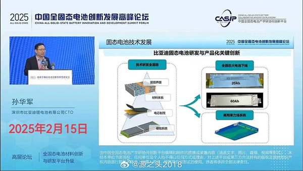 쑨화쥔(孙华军) 선전 BYD 리튬배터리 최고기술책임자(CTO)는 지난달 15일 제2회 중국 전고체 배터리 혁신 및 개발 서밋 포럼에서 자사가 지난해 파일럿 생산 라인에서 60Ah 전고체 배터리를 생산했다고 밝혔다. 이 회사는 2027년경 전고체 배터리의 대량 시연과 설치를 시작하고 2030년 이후에는 대규모 설치에 들어갈 예정이다.