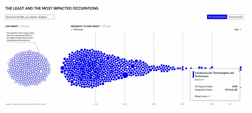 한편, 차트 오른쪽 위 View by sector(부문별 보기)를 클릭하면 직업군에 따라 AI 영향력 지수를 보여주는 점 나열 차트(Dot Strip Plot)를 확인할 수 있는데요! 세로축은 산업 분야를, 가로축은 AI 영향력 지수를 보여주고 있습니다. 여러분은 어떤 색 점이 두드러지게 보이시나요? 위에서부터 보면 남색, 노란색, 주황색 점의 수가 많은 것을 알 수 있는데요. 해당 색이 나타내는 Health care and social assistance(건강관리 및 지원), 제조업(Manufacturing), Education Services(교육 서비스업)의 AI 영향력이 높다고 해석할 수 있겠네요!
