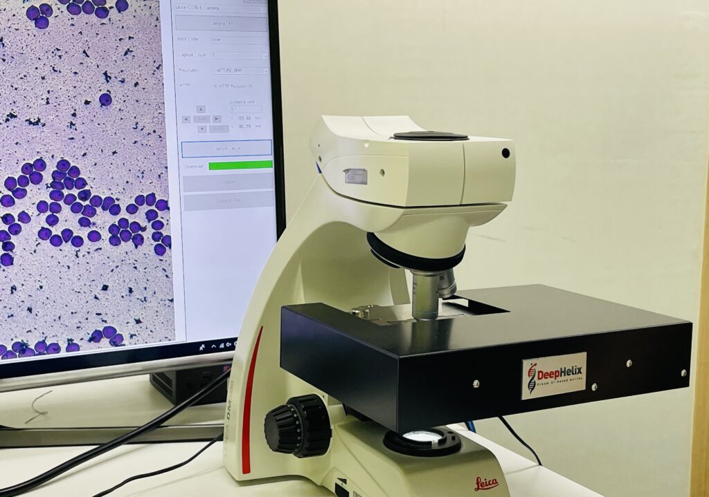 딥헬릭스의 솔루션은 혈액만 넣으면 기계가 알아서 백혈구를 찾아 촬영하고 AI가 구분해 줍니다. 의사가 현미경을 보는 단계를 줄여서 스트레스를 해결하고 효율성을 높여줍니다.