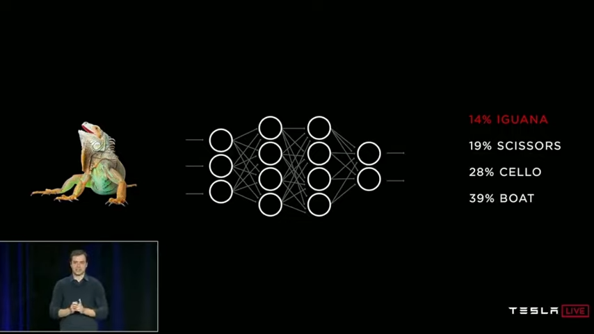 처음 컴퓨터에 이구아나의 그림이 입력되면, 뉴럴 네트워크를 거쳐 4가지 답변이 나옵니다. 10%는 이구아나, 20%는 가위, 30%는 첼로, 40%는 보트 이렇게 나옵니다. 정답률이 10%에 불과하죠