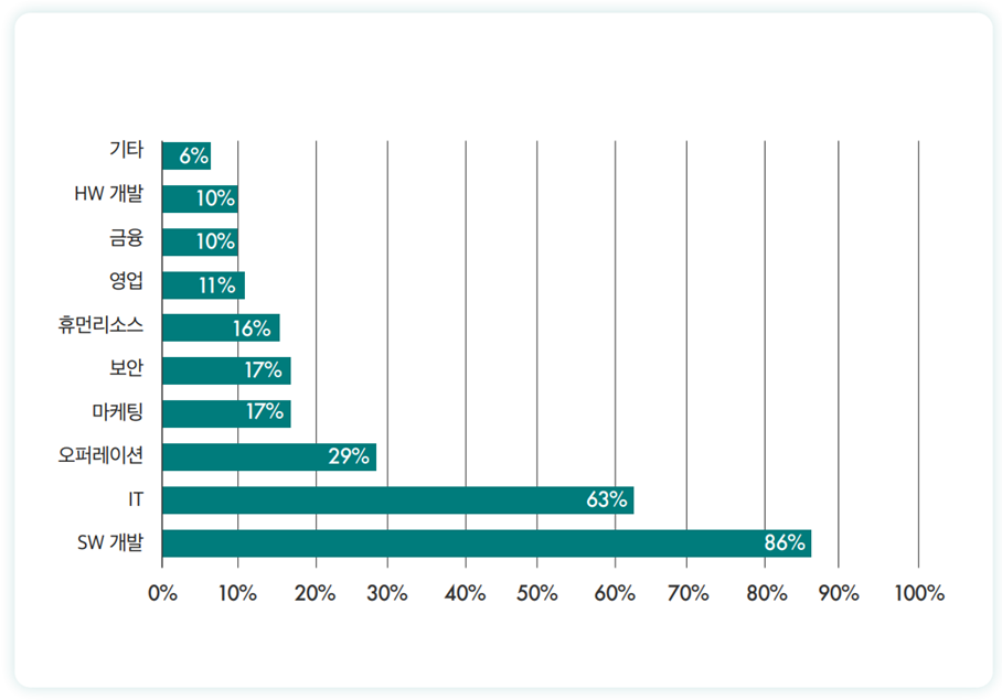 먼저 어떤 기업이 Agile을 적용하는지 살펴보면 아무래도 SW 개발 및 IT 관련 회사들이 압도적으로 높은 비중을 보이는 것을 알 수 있다. 이것은 여러가지 이유가 있기는 하지만 Agile 방법론이 아무래도 SW개발에 초점이 맞춰져 있기 때문인 것이 가장 큰 이유로 보여지고, 변화에 가장 능동적으로 대응하고 현재의 디지털 변화를 이끌어 가는 기술이 IT 기술인 것도 한 원인으로 보여 진다.