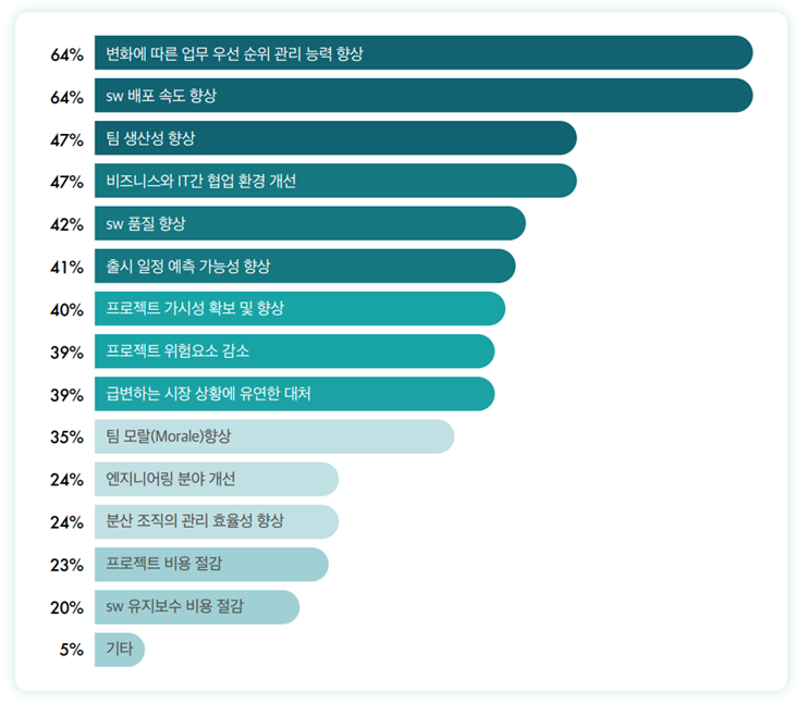 하지만 관심을 가지고 볼 것은 마케팅, 보안, 휴먼 리소스 같은 분야도 적지 않은 비중이 적용을 하고 있다는 것이다. 또한 상대적으로 낮은 비율이긴 하지만 영업, 금융, HW 개발도 이미 Agile을 적용하고 있다는 것이 주목할 필요가 있을 듯하다. Agile에 단순히 SW 개발뿐 아니라 산업 전반에서 적용되고 있고, 점점 더 그 적용 비율이 커져 가고 있다는 것이다. 우리 기업에 Agile이 맞을까? 하는 고민은 어쩌면 기우일 듯하다. 이미 많은 산업 분야에서 적용을 하고 있으며 나름의 성과도 얻어 내고 있기 때문이다.