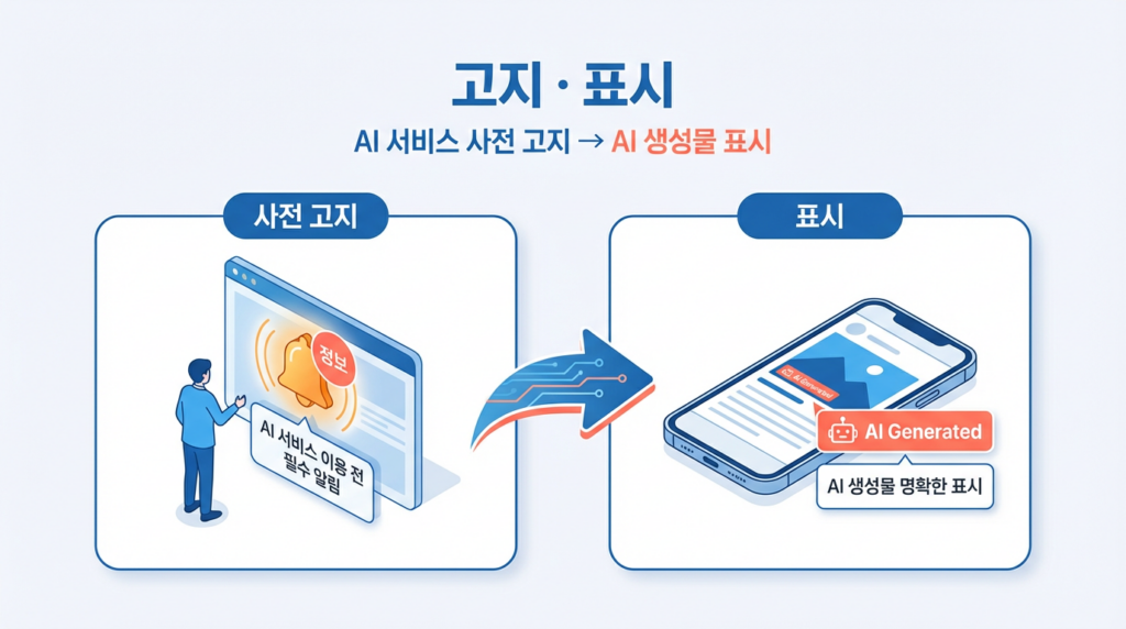 투명성 확보 가이드라인의 핵심은 ‘알린다’는 행위를 하나로 뭉뚱그리지 않고 사전 고지(서비스 자체가 AI 기반이라는 사실)와 표시(결과물이 AI 생성물이라는 사실)로 갈라서 안내한다는 점이다. (이미지=젠스파크로 생성)