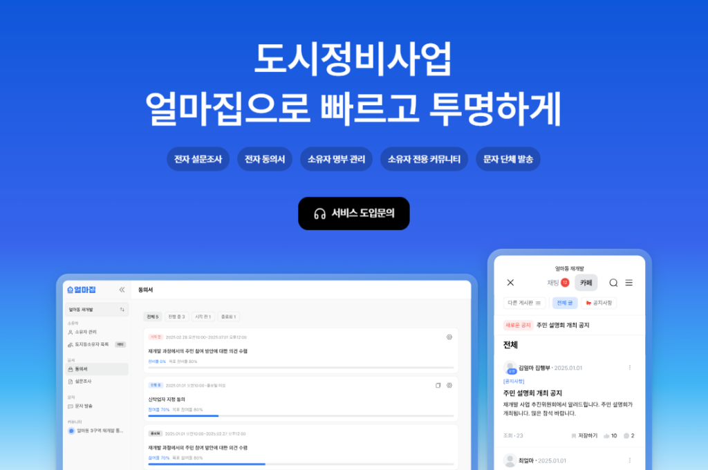 성과도 뚜렷하다. 목동신시가지 3단지 재건축 추진위는 얼마집을 통해 외부 홍보 없이 3개월 만에 동의율 60%, 6개월 만에 75% 이상을 달성해 조합 설립 요건을 충족시켰다. 최근에는 대시보드를 고도화해 등기부 등본 목록 등 주요 서류를 통합 조회할 수 있도록 개선했고, 팁스(TIPS) 프로그램에도 선정돼 후속 투자를 준비 중이다.