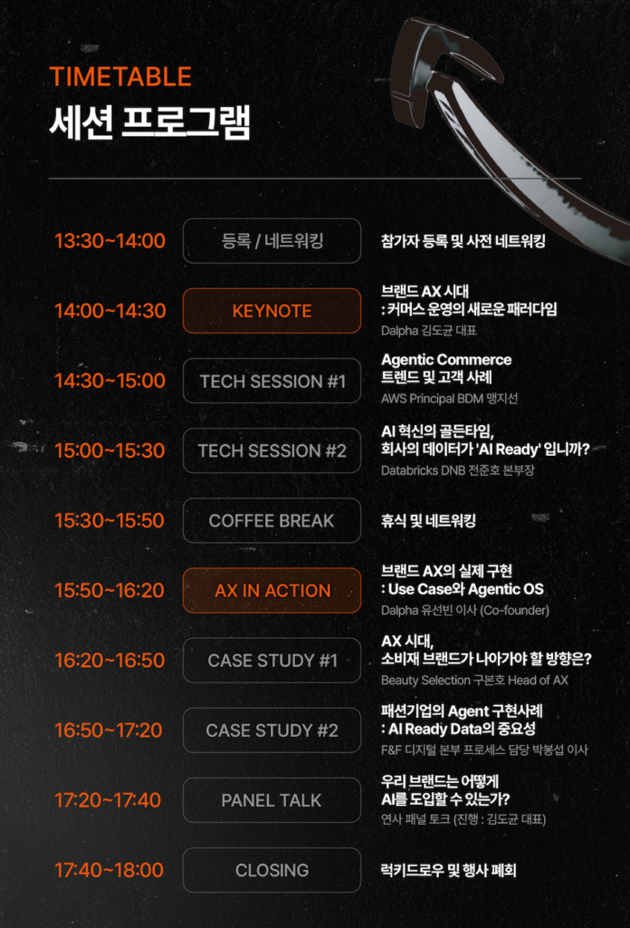 행사는 기조연설과 기술 세션, 사례 발표 등으로 구성된다. 기조연설에서는 달파 김도균 대표가 AI 에이전트가 커머스 산업 구조에 미치는 변화를 중심으로 새로운 운영 패러다임을 제시한다.
