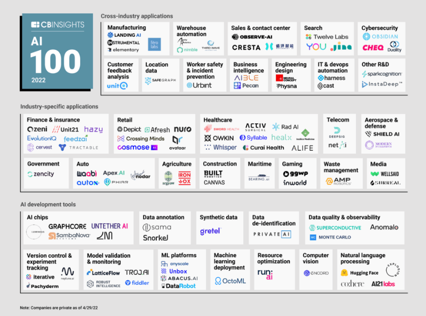 이 PM의 발표는 올해 글로벌 AI 100대 스타트업의 특징을 설명하며 시작됐다. 이들 100대 스타트업의 특징 몇 가지 중 우선 눈에 띈 것은 기업가치 1조원 이상을 평가받은 유니콘 기업이 16개 달한다는 점이다. 또 분야는 헬스케어, 금융/보험의 비중이 높았다. 가장 많은 AI 스타트업을 보유한 국가는 73개를 기록한 미국이었고, 그 뒤를 영국, 캐나다 등이 잇고 있다.