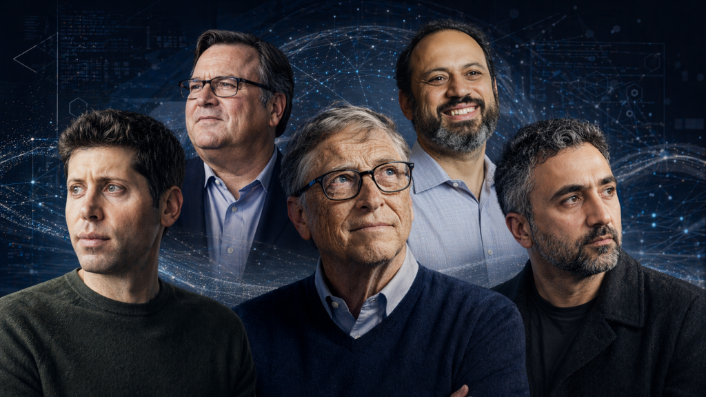 생성형 인공지능 시대를 이끄는 주요 혁신가들. (왼쪽 위 첫 번째부터 시계 방향) 리드 호프먼(LinkedIn 공동 창업자), 이선 몰릭(펜실베이니아대 와튼스쿨 교수), 무스타파 술레이만(Microsoft AI CEO), 빌 게이츠(Microsoft 공동 창업자), 샘 올트먼(OpenAI CEO). (이미지=AI로 생성)