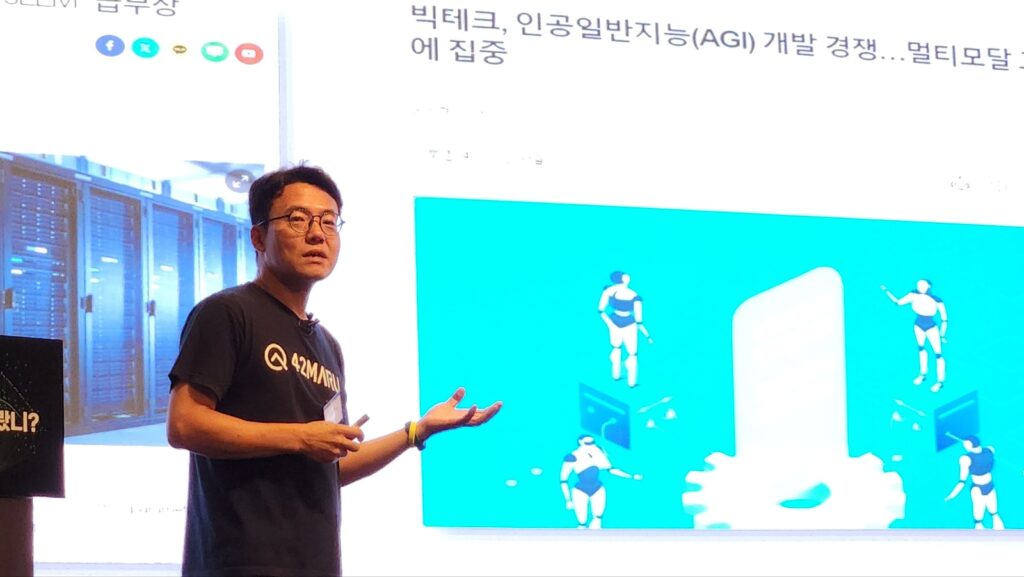 이어 본격적인 기조연설 무대에는 KT AI 퓨처랩을 이끄는 배순민 랩장이 올라 ‘한국적 AI 추진과 응용’을 주제로 KT의 전략과 철학, 실제 성과를 공유했다.