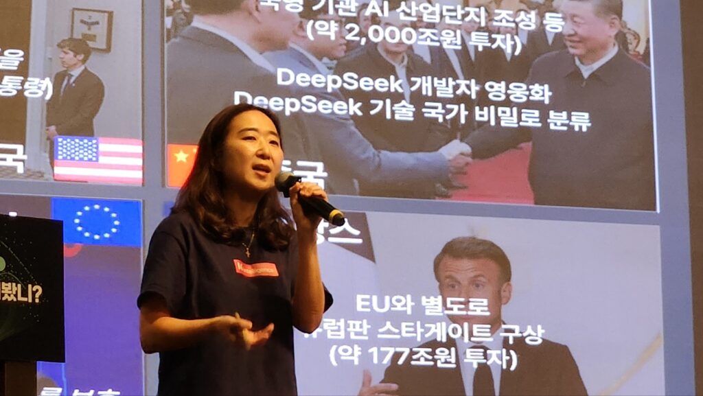 발표 서두, 배순민 랩장은 “지금은 AI의 국가주의 시대”라며 “미국, 중국, EU, 프랑스 등 주요국은 AI에 수백조 원을 투입 중”이라고 전쟁 수준으로 격화되고 있는 글로벌 AI 투자 경쟁 상황을 언급했다. 그러면서 올해 파리에서 개최된 AI 서밋의 한 장면을 떠올렸다.