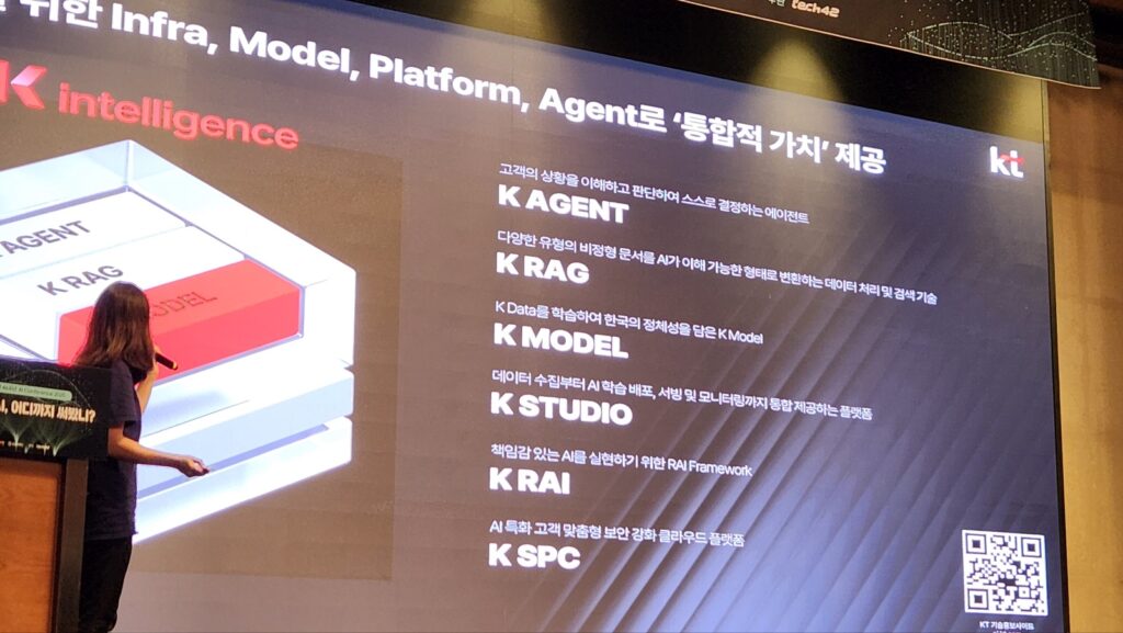 그러면서 배 랩장은 “업무 요청이 들어오면 ‘이 일을 AI가 할 수 있을까’를 먼저 고려한다”며 “이는 모든 일에 대해 AI 에이전트(agent)를 우선 고려하는 KT 내부의 기본 원칙”이라고 설명했다. 이러한 방향성을 뒷받침하는 것이 ‘K-Intelligence’다. 배 랩장의 설명에 따르면 K-Intelligence는 KT가 구축 중인 AI 전환 프레임워크로 고객의 상황을 이해하고 판단해 스스로 결정하는 'K-AGENT', 다양한 유형의 비정형 문서를 AI가 이해 가능한 형태로 변환하는 K-RAG, 데이터를 학습해 한국의 정체성을 담은 K-MODEL, 데이터 수집부터 AI 학습 배포, 서빙 및 모니터링까지 통합 제공하는 K-STUSIO, 책임감 있는 AI 실현을 위한 K-RAI, AI 특화 고객 맞춤형 보안 강화 클라우드 플랫폼 K-SPC등으로 구성된다.