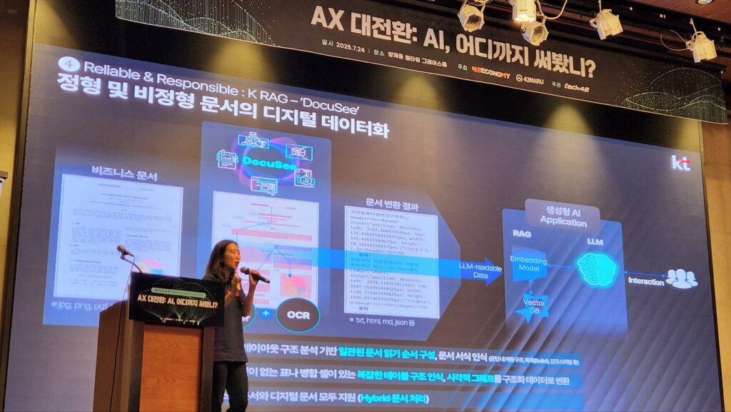 기술적 측면에서도 KT는 문서 파싱(document parsing), 필터링, OCR(광학문자인식), 리트리벌(Retrieval) 등을 통해 비정형 데이터를 AI가 이해할 수 있도록 가공하고 있다. 이 과정을 통해 만들어진 솔루션 ‘도큐씨(DocuSee)’는 현재 내부에서 가장 우수한 성능을 가진 데이터 처리 툴로 평가받고 있다.