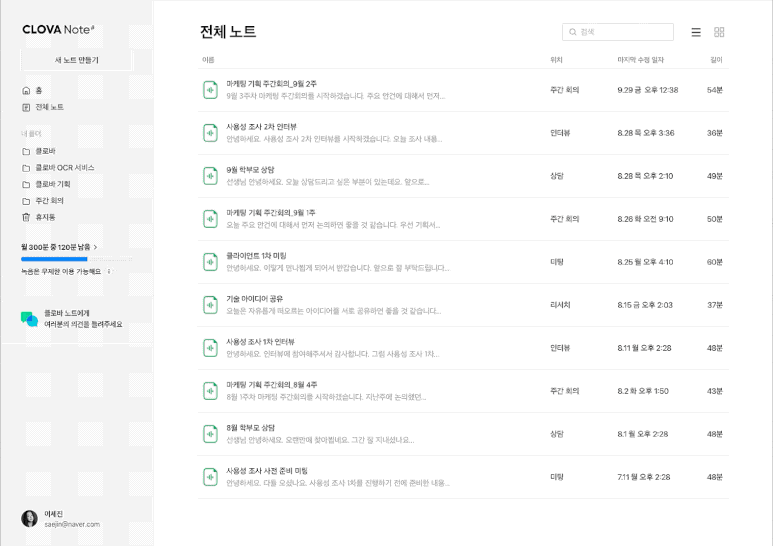 대표적인 서비스는 클로바 노트다. 음성을 문자로 변환해주는 해당 서비스는 네이버 클로바 AI 플랫폼 위에서 제공한다. 녹음된 목소리를 AI가 학습한 한국어 데이터에서 추출해 사람 대신 녹취 기록을 해주는 것. 클로바 노트는 회의록 작성 등 이전에 사람이 직접 듣고 기록했던 작업의 1차 수고를 덜어줘 사용자 편의성을 높이고 있다.