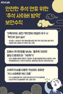 추석을 맞아 코로나19 특별 방역대책이 발표된 가운데 안랩이 추석 연휴기간을 안전하게 보내기 위한 ‘추석 사이버 방역’ 보안수칙을 발표했다. 안랩이 발표한...