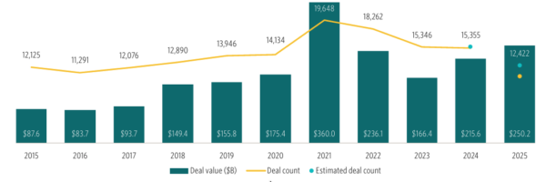 피치북-NVCA ‘벤처 모니터’ 1차 데이터에 따르면 2025년 글로벌 VC 딜 가치는 5,120억달러로 역대 두 번째 수준을 기록했다. AI가 전체 딜 가치의 절반 이상을 차지하며 투자 흐름을 주도했지만, 펀드레이징은 1,186억달러로 10년 내 최저치를 기록해 시장 양극화가 이어지고 있다.
