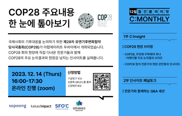임팩트투자사 소풍벤처스는 오는 14일 <COP28 주요내용 한 눈에 톺아보기>라는 주제로 온라인 세미나를 개최한다고 밝혔다. 총 2부로 진행되는 세미나는 제28차 유엔기후변화협약...
