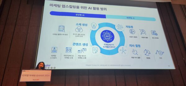 ‘2024 CX 마케팅:주요 트렌드와 AI를 통한 업스킬링 전략’을 주제로 무대에 나선 고 본부장은 인공지능 및 데이터 기반 의사결정과 마케팅 실행 고도화를 통해 기업들에게 지속적인 성장을 지원하는 애피어에 대한 소개말로 발표를 시작했다.