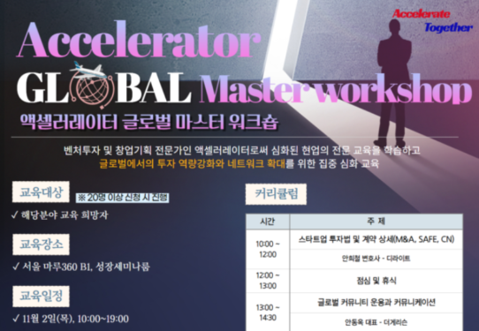 사단법인 한국액셀러레이터협회는 총 9시간 과정의 ‘액셀러레이터 글로벌 마스터 워크숍(Accelerator Global Master workshop)’을 서울 마루 360 성장세미나룸에서 개최한다고 24일 밝혔다. 다음달...