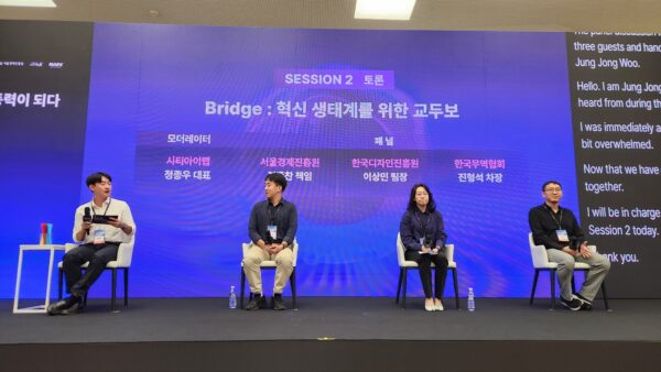 이날 첫 번째 세션은 ‘Possibility : 오픈이노베이션을 통한 AI 도입과 실험’을 주제로 진행됐다. 패널토론은 앞서 발표를 맡았던 포비콘 송중석 대표가 모더레이터로 나섰다. 패널로는 이규호 현대자동차 팀장, 한효건 삼성증권 수석, 한진원 롯데건설 책임이 참여해 저마다 현업에서 경험한 AI 도입과 오픈이노베이션 전략을 공유했다.