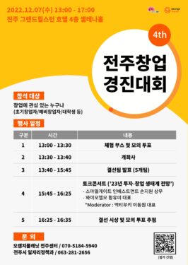 스마일게이트 오렌지플래닛 창업재단(이하 오렌지플래닛)은 전주시와 손잡고 전주 그랜드힐스턴 호텔에서 ‘제4회 전주창업경진대회’를 개최한다고 30일 밝혔다. 내달 7일 개최되는 이번 창업경진대회에서는 성장...