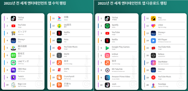 [AI요약] 글로벌 앱 마켓 정보를 제공하는 Sensor Tpwer의 ‘2021년 엔터테인먼트 앱 시장 리포트’에 따르면 지난해 엔터테인먼트 분야에서 글로벌 앱 다운로드...