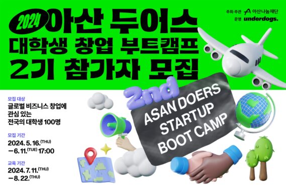 아산나눔재단은 예비 글로벌 창업가를 꿈꾸는 대학생을 대상으로 ‘아산 두어스 (Asan Doers) – 대학생 창업 부트캠프’의 2기 참가자 100명을 모집한다고 16일...
