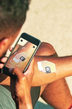 게토레이의 개인 수분 추적용 Gx스웨트 패치를 착용한 사용자가 이를 체크하는 모습. 스트레처블 배터리는 일반적으로 알려진 ‘플렉서블 배터리’와는 다르다. 플렉서블 배터리는 종이처럼 굽혀지기까지는 하지만 늘어나지는 않는다. 반면 스트레처블 배터리는 중심인장력(引張力), 즉 물체의 종방향으로 잡아당기거나 압축하는 것을 포함하는 힘을 견디고 그러한 힘이 가해지면 탄력성있게 늘어난다는 점에서 차별화된다. 이러한 향후 피트니스 트래커, 웨어러블 전자제품, 심지어 스마트 의류의 에너지 저장매체 역할을 할 것으로 기대를 모은다.