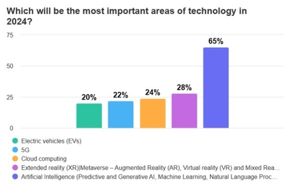 ‘2024년과 그 이후의 기술 영향: IEEE 글로벌 연구’라는 보고서에서 가장 중요한 기술 영역 1위를 차지한 AI는 무려 58%의 응답률로 20%대의 응답률에 그친 나머지 4개분야(확장현실, 클라우드 컴퓨팅, 5G통신, 전기차)를 월등하게 능가했다. 이는 AI가 내년도 기업의 최대 화두이자 대세 관심 기술 영역임을 확연하게 보여준다. 최대 AI 활용 분야로는 실시간 사이버 보안 개선, 공급망 및 창고자동화 효율성 제고, SW 개발 가속화 등이 꼽혔다. 이와 함께 나머지 4개 기술 분야에 대한 결과도 소개한다.