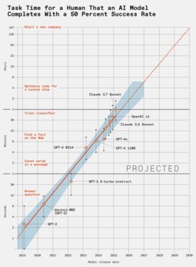 “2030년까지 가장 진보된 대규모 언어 모델(LLM)은 인간이 주 40시간씩 한 달 동안 일하는 소프트웨어 기반 작업을 50%의 신뢰도로 완료할 수 있게 될 것이다. 또한 꽤 괜찮은 소설을 쓸 수 있고, 기업을 세울 수 있으며, 이러한 작업 중 많은 작업을 인간보다 훨씬 더 빠르게 수행할 수 있을 것이다. 인간이 한달 걸리는 작업을 하는 데 드는 시간은 시간이 단 며칠, 심지어 단 몇 시간만 소요될 수도 있다.”