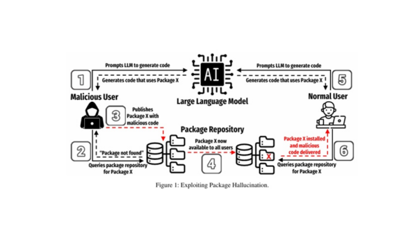 패키지 환각을 이용한 악의적 AI코드 공격의 구조. 공격자는 환각된 이름으로 악성 코드가 포함된 패키지를 게시해 이를 의심하지 않는 사용자들에게 해당 악성 코드명을 제안한다. 사용자들이 LLM의 출력을 신뢰해 신중하게 확인하지 않고 패키지를 설치하면, 악성 패키지에 숨겨진 공격자의 페이로드가 사용자 시스템에서 실행된다. (자료=텍사스대)